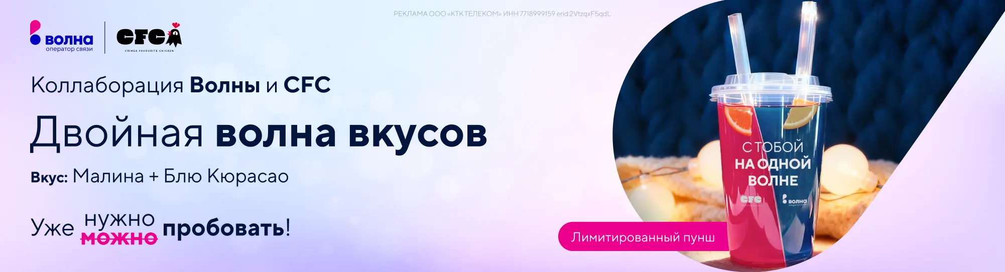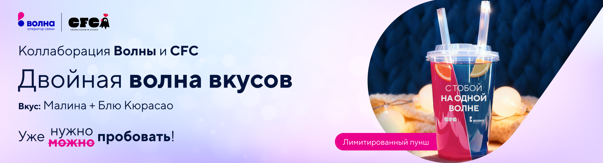 «Двойную волну вкусов» можно попробовать в любом ресторане быстрого питания CFC за 299₽. Успей оценить новинку одним из первых и готовься к расспросам, откуда такой необычный напиток.